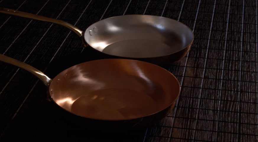 Hand-made Copper pan lined in silver, 26cm diameter, brass handle hand-made. Hand wash only. Not dishwasher safe.