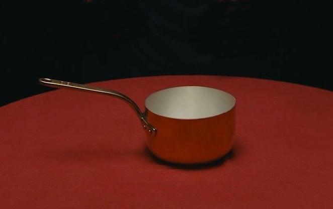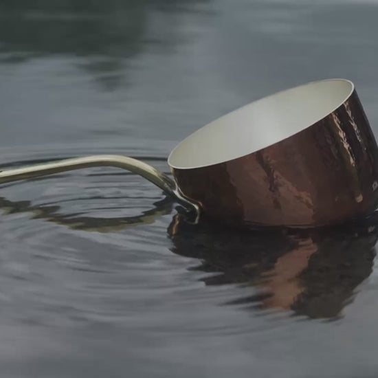 Hand-made Copper pot lined in silver, 16cm diameter, brass handle hand-made. Hand wash only. Not dishwasher safe.